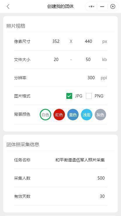 3、按要求進(jìn)行照片尺寸設(shè)置,并填寫需要采集的個(gè)人信息、采集人數(shù)、截止時(shí)間等信息。