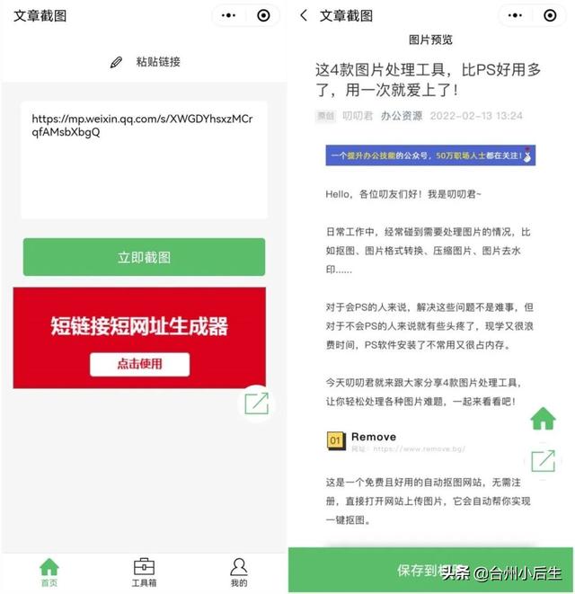 而這個(gè)小程序就是用來幫助你截圖文章的實(shí)用工具,只需要把文章的網(wǎng)址鏈接粘貼進(jìn)去,就可以快速生成完整的文章截圖,不用自己滑動(dòng)頁面查看,非常方便!