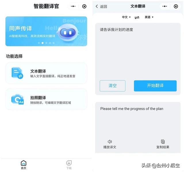 可以選擇直接輸入文本翻譯,也可以拍照識(shí)別和翻譯。同時(shí),完成翻譯之后,這個(gè)小程序還能夠播放對應(yīng)的譯文語音,不用擔(dān)心自己發(fā)音不標(biāo)準(zhǔn)!