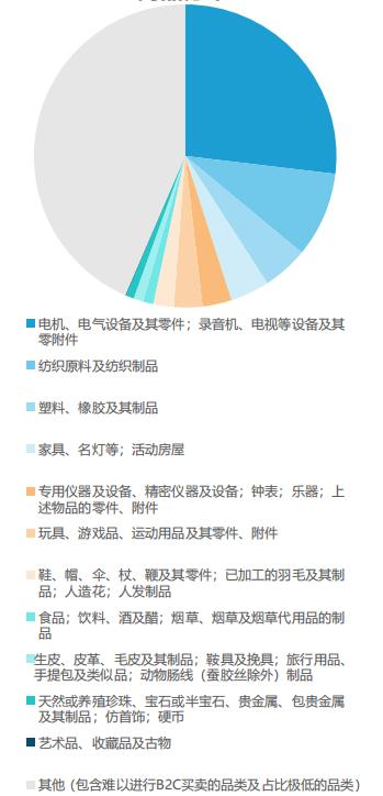 從中國出口商品品類分布及跨境電商B2C企業(yè)售賣品類分布得到,跨境電商出口商品主要集中于服裝鞋帽、數(shù)碼3C、家具家居、運動戶外、美妝、手工園藝等也擁有較高的出口。