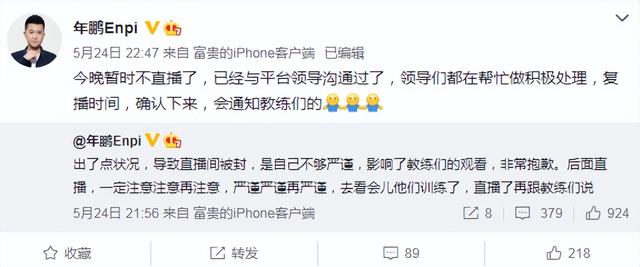 據(jù)年鵬自己所說(shuō),直播間出了一點(diǎn)狀況,導(dǎo)致直播間被封,還表示自己以后一定注意注意再注意,隨后稱和平臺(tái)領(lǐng)導(dǎo)已經(jīng)溝通過(guò)了,都在幫忙做積極處理,具體復(fù)播時(shí)間等通知。