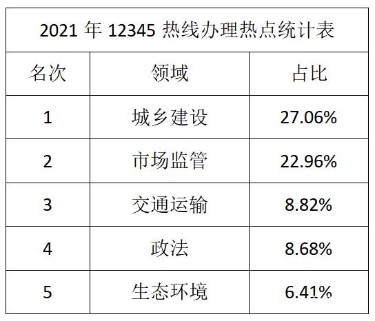 分析12345熱線大數(shù)據(jù),2021年全市群眾關(guān)于城鄉(xiāng)建設(shè)、市場(chǎng)監(jiān)管、交通運(yùn)輸領(lǐng)域的來(lái)電訴求相對(duì)集中,占比位列前三。