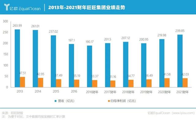 以旺旺為例,2013年業(yè)績巔峰之后,旺旺便自此走上“下坡路”。財報顯示,到了2016財年,公司營業(yè)收入已從263.99億元跌至190.17億元,歸母凈利潤從47.51億元降至33.37億元(按發(fā)稿時匯率計算)。