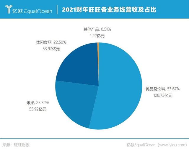 目前,旺旺集團的主營產(chǎn)品分為四大類:米果類、乳品及飲料類、休閑食品類及其他產(chǎn)品(主要為酒類、其他食品)。2021財年,四大產(chǎn)品線的營收55.92億元、128.74億元、53.97億元和1.22億元,分別占總營收的23.32%、53.67%、22.5%和0.51%。