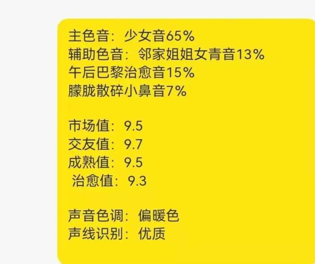 她會給每個人的聲音貼上一些個性化標(biāo)簽,比如——公鴨嗓、雨后小清新、午后巴黎治愈音、深夜電臺音,還會根據(jù)市場值、交友值、成熟值、治愈值來打分。
