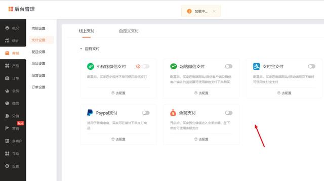在管理后臺(tái)中,我們可以商城的開(kāi)通線上支付功能,例如微信、支付寶、以及PAYPAL跨境等支付方式。