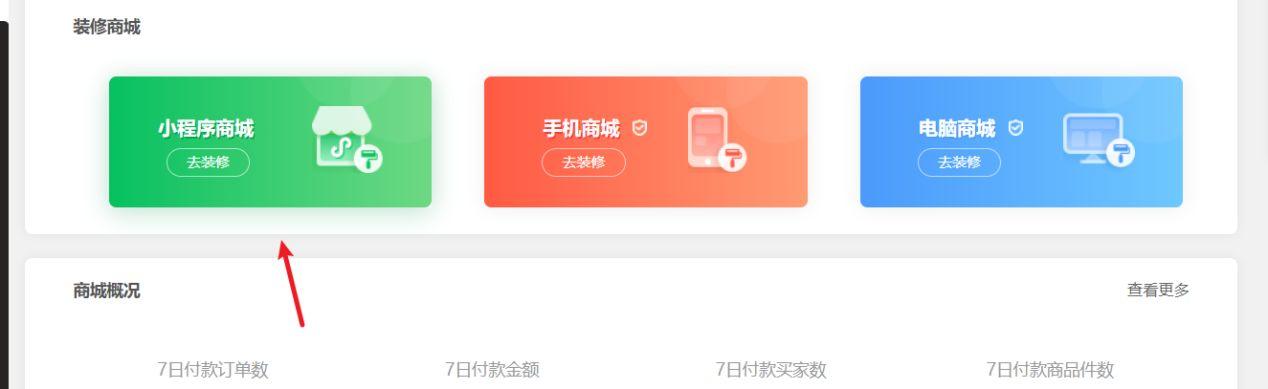 在商城管理頁(yè)面中,我們可以分別可以在小程序、手機(jī)以及PC端中搭建商城,這里選擇小程序商城,點(diǎn)擊去裝修選項(xiàng)。就可以進(jìn)入小程序商城模板頁(yè)面。