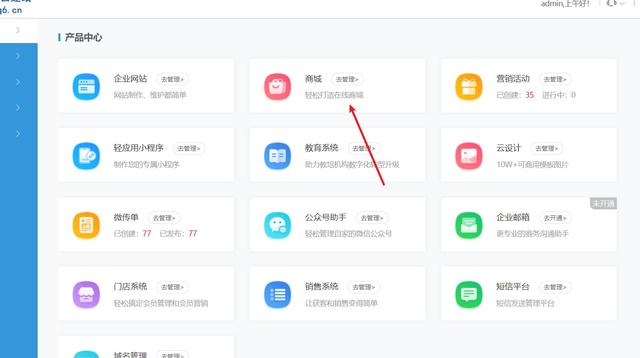 我們需要先登陸喬拓云智能建站平臺(tái),沒(méi)有賬號(hào)的可以免費(fèi)注冊(cè)。登陸成功后,就可以在產(chǎn)品中心頁(yè)面找到商城管理選項(xiàng)。