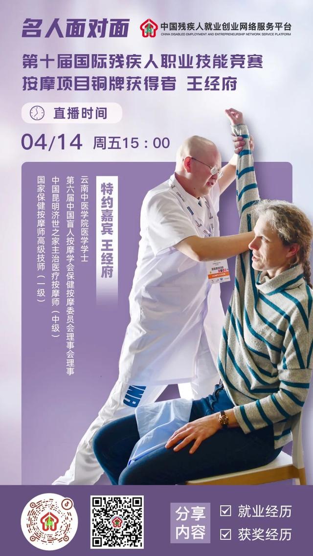 ]]>4月14日15:00,平臺(tái)邀請(qǐng)到第十屆國(guó)際殘疾人職業(yè)技能競(jìng)賽按摩項(xiàng)目銅牌獲得者王經(jīng)府老師,為大家開展一期名人面對(duì)面的勵(lì)志分享直播活動(dòng),分享自己的就業(yè)和獲獎(jiǎng)經(jīng)歷,大家也可以在直播間與王老師咨詢互動(dòng),提升學(xué)習(xí)、就業(yè)的信心。屆時(shí),平臺(tái)小鵝通、抖音、快手、視頻號(hào)、百家號(hào)直播間將同步播出,歡迎大家搜索“中國(guó)殘疾人就創(chuàng)業(yè)”相關(guān)視頻賬號(hào)預(yù)約觀看。