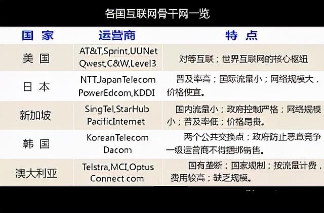 不管是亞洲還是其他歐美發(fā)達國家,根據(jù)各國的具體市場不同,經(jīng)濟制度的不同,互聯(lián)網(wǎng)骨干網(wǎng)的發(fā)展也各有千秋,我們可以從下圖的表格一窺究竟: