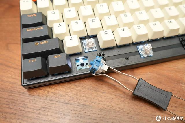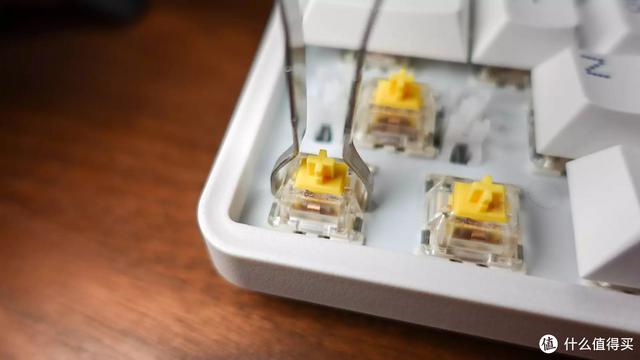 這款鍵盤機(jī)身很厚,前面的結(jié)構(gòu)好幾層,所以內(nèi)部比較充實,側(cè)面那個白色的小方塊就是橡膠墊,按鍵帽可以看到內(nèi)部結(jié)構(gòu)有彈性。