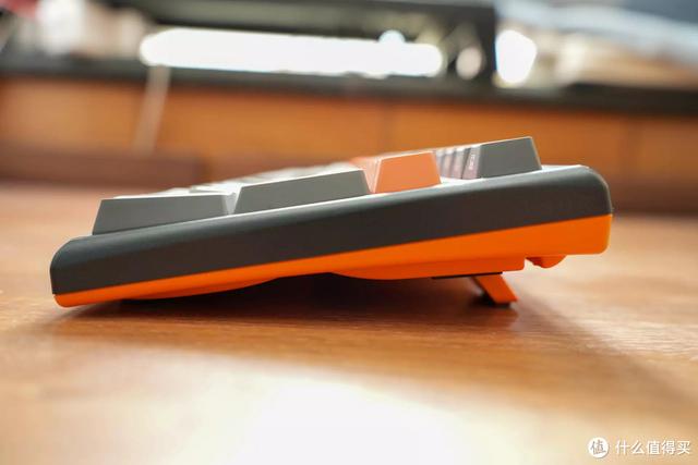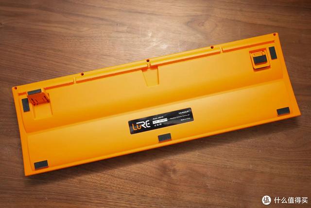 鍵盤背后三向走線,雙端腳撐,該有的小設(shè)計都有,橘黃色底部看起來格外顯眼,和正面數(shù)字鍵位一條黃交相呼應(yīng)。