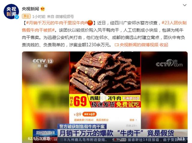 ]]>近日,經(jīng)四川廣安鄰水警方偵查,23人團(tuán)伙制售假牛肉干被抓。該團(tuán)伙以較低價(jià)購入風(fēng)干鴨肉干,人工切割成小塊后,包裝為牦牛肉干售賣。為逃避公安機(jī)關(guān)打擊,他們在鄰水、成都的偏遠(yuǎn)山村建立窩點(diǎn),團(tuán)伙中有負(fù)責(zé)洗錢的、負(fù)責(zé)刷單的,涉案金額1230余萬元。(據(jù)9月19日央視新聞)