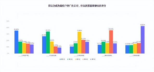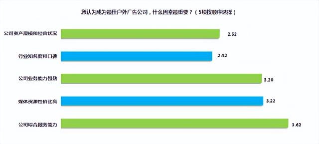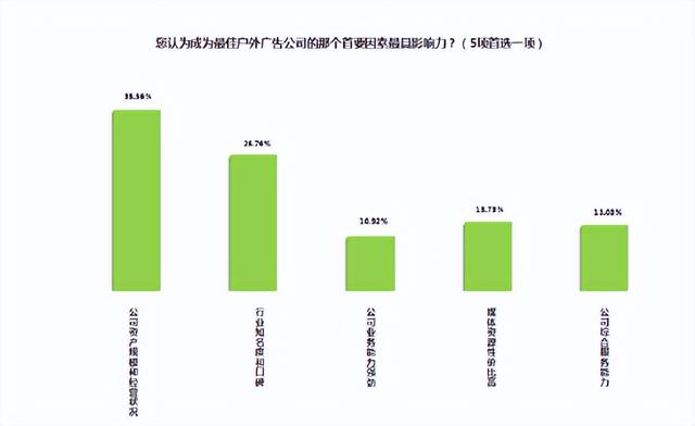 隨著數(shù)字戶外的發(fā)展,戶外廣告公司的競價(jià)也越發(fā)激烈,公司的綜合服務(wù)能力為重要的考核要求。根據(jù)本次認(rèn)為最佳戶外廣告的決定性因素選項(xiàng)中,“公司資產(chǎn)規(guī)模和經(jīng)營狀況”、“行業(yè)知名度和口碑”、“公司業(yè)務(wù)能力強(qiáng)勁”、“媒體資源性價(jià)比高”、“公司綜合服務(wù)能力”五大項(xiàng)目成為了最佳戶外廣告公司評選的重要因素。其中“公司的綜合業(yè)務(wù)能力”成為了最重要的考核因素。