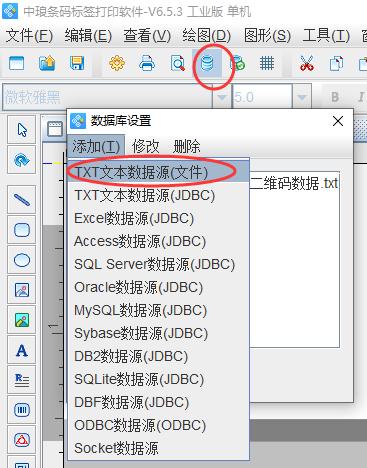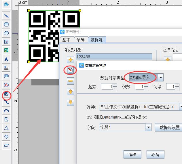 1)點(diǎn)擊軟件左側(cè)的”二維碼按鈕”在畫(huà)布上繪制二維碼對(duì)象,雙擊二維碼,在”圖形屬性-數(shù)據(jù)源”中,點(diǎn)擊”修改”按鈕,在數(shù)據(jù)對(duì)象類型中選擇“數(shù)據(jù)庫(kù)導(dǎo)入”;