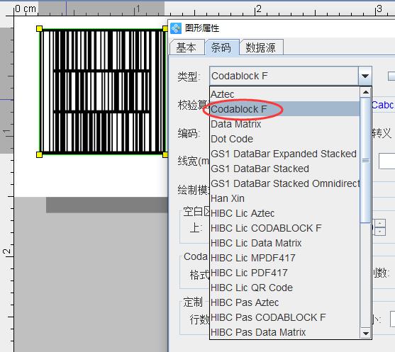 2)并打開(kāi)二維碼的圖形屬性,將二維碼類型選擇為Codablock F;