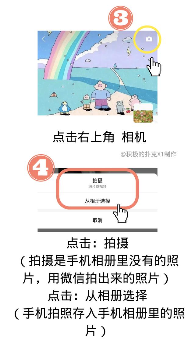 先點(diǎn)擊小相機(jī),后會(huì)出現(xiàn)第四步,選擇相冊(cè)可以從手機(jī)相冊(cè)里選擇多個(gè)照片或一個(gè)短視頻,微信拍照只能拍照一張或長(zhǎng)按拍短視頻