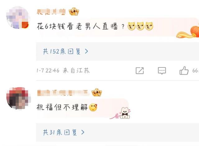 對于這一行為有很多網(wǎng)友表示了疑惑,紛紛在評論區(qū)發(fā)表了自己的觀點(diǎn),稱:“花6塊錢看老男人直播”,“怕是比有些人爸爸的年紀(jì)還大”,看來網(wǎng)友對于花錢看痞幼男友還是存在很大的爭議。