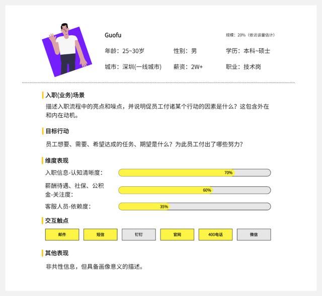 為了體現(xiàn)群體的共性,基于單一/組合維度識別下,弱化群體中每個個體的形象與特色,從而聚合的一類用戶共有特征。這個被虛構(gòu)的角色不一定真實(shí)存在,但在探討過程中,可以依此為溝通的樣本,開展工作。