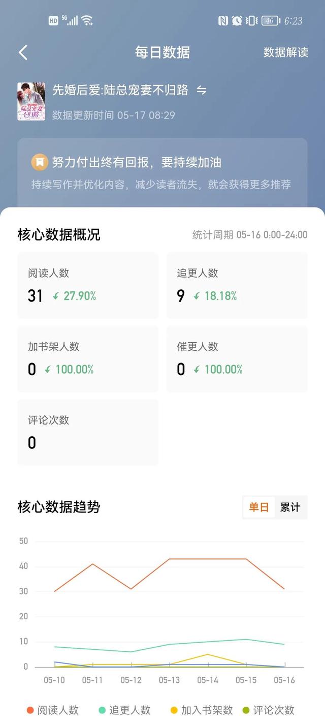 小說閱讀人數(shù)還是那么幾個(gè)人,因?yàn)檫€沒有到10萬字,番茄還沒推薦,也不是很在意。等到了10萬字再看吧,如果到了那時(shí)候還沒什么人看,估計(jì)就是撲街了。