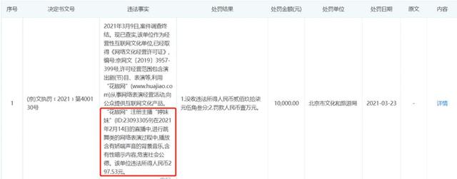 “擦邊球”秀場流線,確實讓花椒和六間房在“千播大戰(zhàn)”中活了下來,而且有了沖刺IPO的可能,但與此同時也帶來了不少負(fù)面效應(yīng)。根據(jù)企查查信息顯示,2018 年至 2021 年三月,花椒直播運(yùn)營公司北京密境和風(fēng)科技有限公司涉及 5 次行政處罰,原因全部為直播中涉及低俗、性暗示等內(nèi)容。同樣原因,也讓花房集團(tuán)涉及到兩次行政處罰。