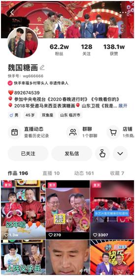 魏生國喜歡在快手上記錄自己糖畫制作的過程,自2016年開播以來,魏生國和其糖畫作品備受歡迎,如今他已積累了62.2萬粉絲。魏生國稱:“我經(jīng)常直播開1個小時,回復(fù)網(wǎng)友們的留言和私信要花3個小時。”