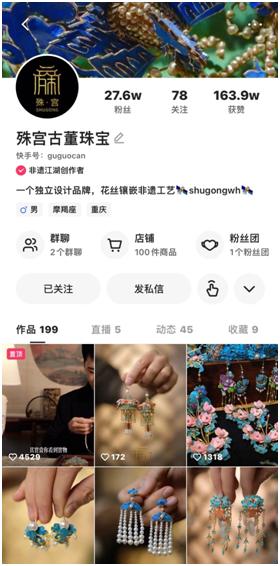 辜國強也感受到了快手平臺粉絲們的熱情,幾年來他在快手賬號“殊宮古董珠寶”上傳了一百多段花絲鑲嵌的短視頻,目前獲贊超過160萬,視頻的最高播放量達740多萬。他制作的有著中國傳統(tǒng)文化元素的胸針、耳環(huán)、發(fā)夾等首飾,也逐漸成為流行單品。