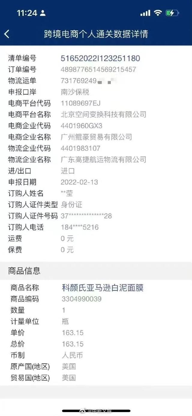 而“跨境電商個人通關(guān)數(shù)據(jù)詳情”則顯示,2022年2月13日,消費者“**瑩”通過由“北京空間變換科技有限公司”持有的抖音電商平臺購買了一瓶“科顏氏白泥面膜”。這瓶面膜的實際供貨企業(yè)是“廣州鯤豪貿(mào)易有限公司”,由廣東高捷航運物流有限公司將該包裹從“廣州南沙綜合保稅區(qū)”運輸?shù)较M者手中。