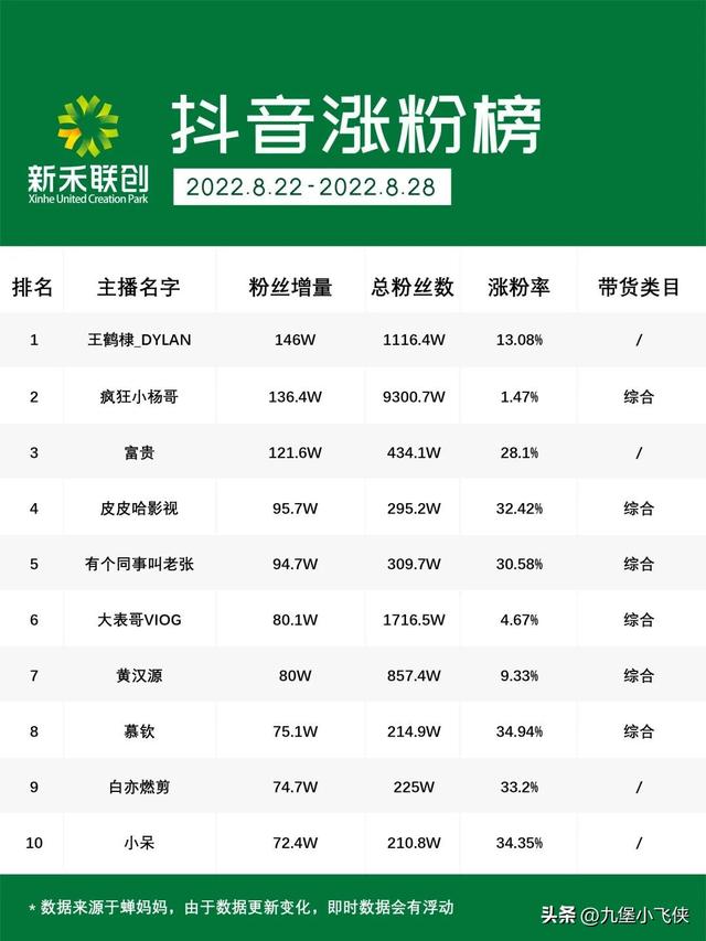 其中,漲粉榜第一名是“王鶴棣_Dylan”,演員王鶴棣因在仙俠劇《蒼蘭訣》是飾演霸氣腹黑男主“東方青倉(cāng)”一角,一周漲粉146萬(wàn),漲粉率13.08%。