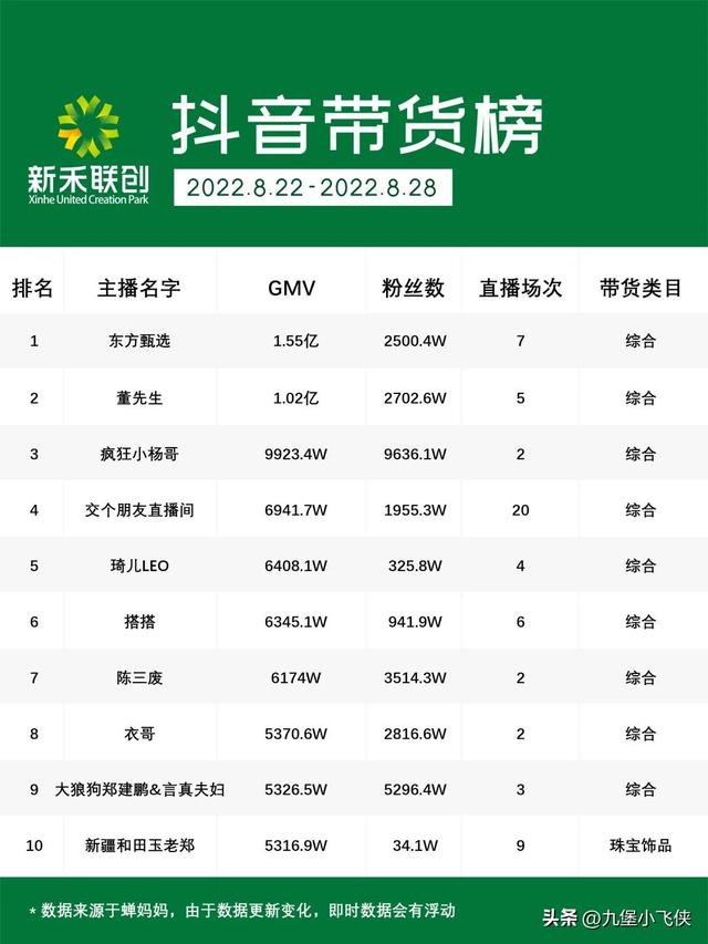 下圖榜單依托數(shù)據(jù)分析平臺(tái)蟬媽媽,數(shù)據(jù)統(tǒng)計(jì)周期為2022年8月22日到2022年8月28日。