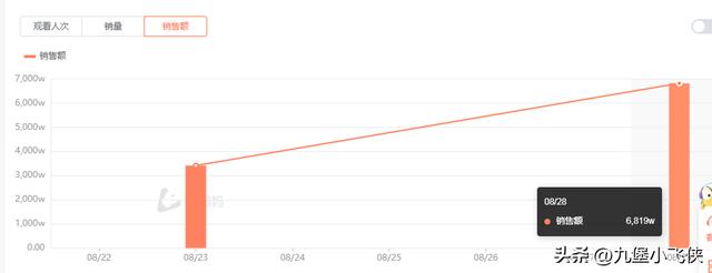 其中銷(xiāo)售額最高的一天為8月28日的1575.4萬(wàn)元,最低的是8月23日的553.3萬(wàn)元,首尾相差1000萬(wàn)左右。