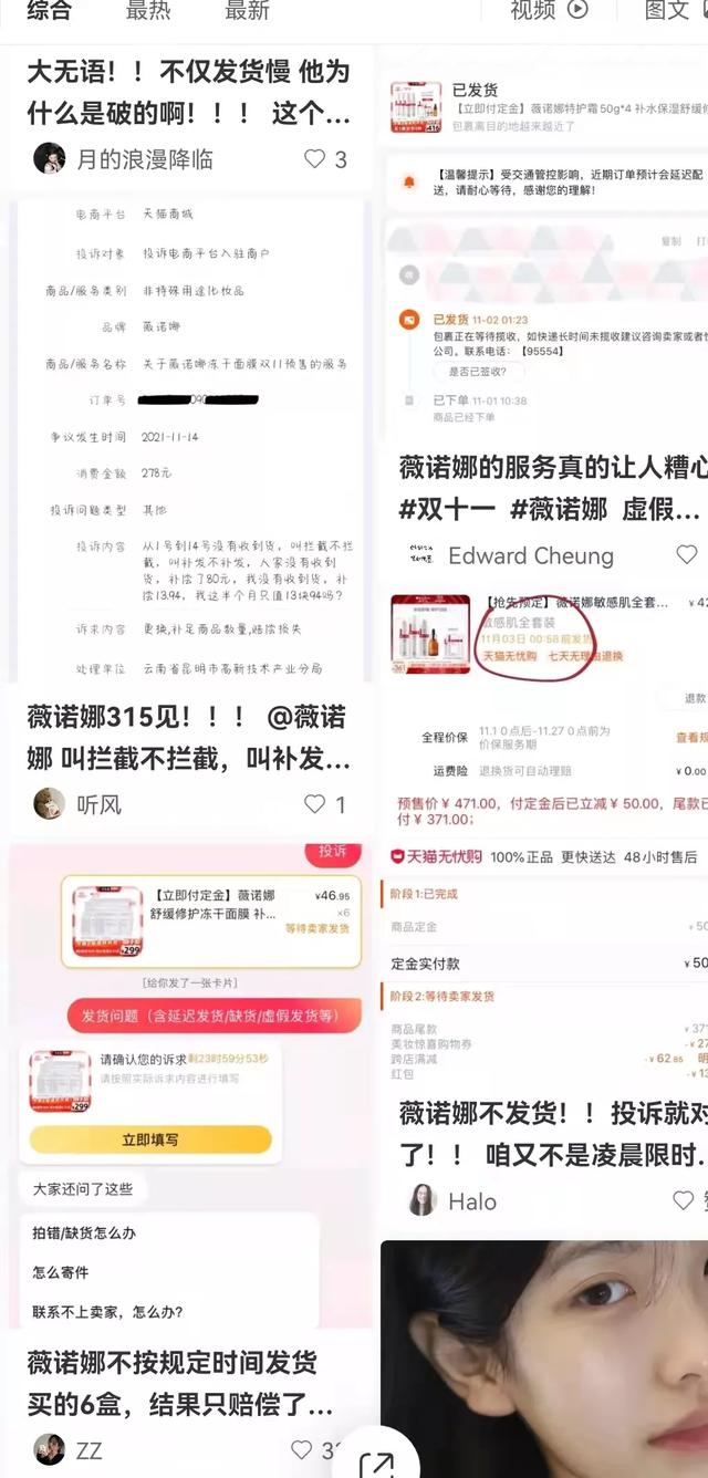 據(jù)財(cái)經(jīng)看點(diǎn)網(wǎng)不完全統(tǒng)計(jì),被消費(fèi)者質(zhì)疑發(fā)貨延遲、甚至虛假發(fā)貨的品牌包括歐萊雅、資生堂、DHC、蒂佳婷、薇諾娜等,其中國產(chǎn)品牌薇諾娜和國際品牌歐萊雅投訴量位居前列。據(jù)黑貓平臺(tái)上搜索發(fā)現(xiàn),在共計(jì)332條投訴信息中,充斥著大量關(guān)于薇諾娜延遲發(fā)貨甚至涉嫌虛假發(fā)貨的投訴。而小紅書上薇諾娜更是幾乎被消費(fèi)者的投訴攻陷,搜索“薇諾娜不發(fā)貨投訴”信息后,小紅書顯示高達(dá)9700多篇負(fù)面筆記。歐萊雅的投訴量,甚至突破1萬條。