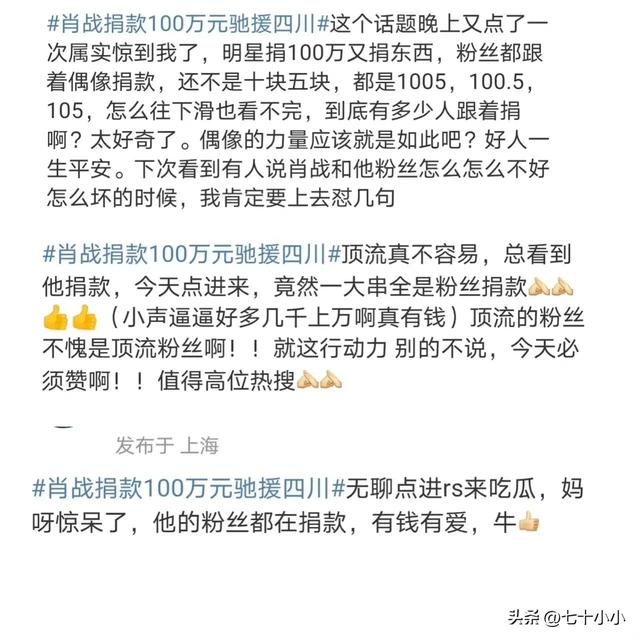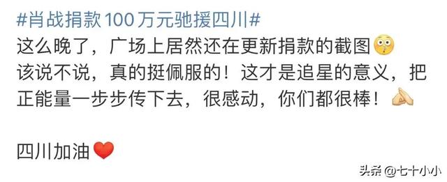 有的網(wǎng)友說(shuō)頂流真的是不容易,總看到他捐款,今天點(diǎn)進(jìn)來(lái)竟然看到一大串他粉絲的捐款。頂流粉絲,不愧是頂流粉絲,這行動(dòng)力值得高位熱搜。也有的網(wǎng)友評(píng)論說(shuō)“這就是偶像的力量,聚沙成塔。感動(dòng)的不是捐款的數(shù)額,而是熱血未冷。本來(lái)想看看肖戰(zhàn)的血雨腥風(fēng)的體質(zhì)的,想著來(lái)吃點(diǎn)瓜,結(jié)果看到的是肖戰(zhàn)粉絲的捐款。真是有點(diǎn)感動(dòng),不管向他們潑多少臟水,他們?nèi)耘f保有赤子之心?!?/p>