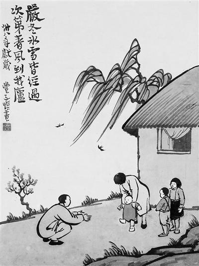 在展中豐子愷《春風(fēng)到我廬》畫面中,可見五口之家在春日聚于草廬前,母親扶著寶寶蹣跚學(xué)步,父親在前方鼓勵(lì)引導(dǎo),哥哥姐姐一旁觀看嬉戲,一家人沐浴在春光里,享受著歡樂時(shí)光。