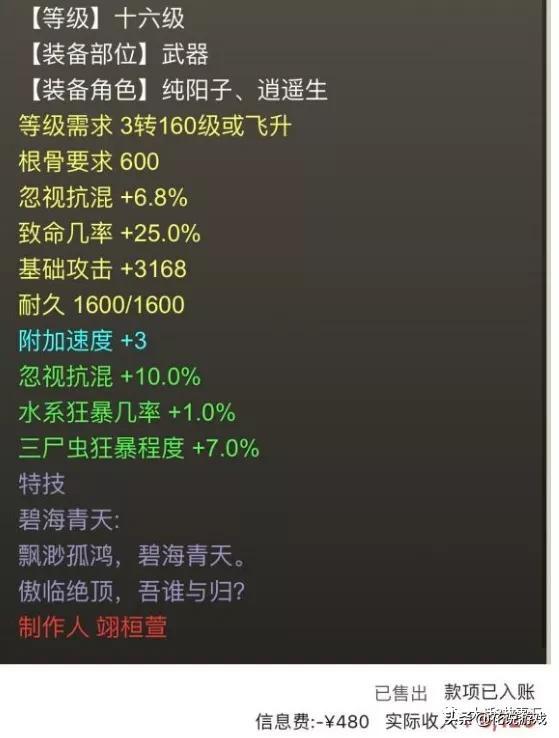 第二個幾率依然是男人裝備的煉化,16級的武器底子是忽視抗混加6.8,藍字是附加速度加3,煉化是極品的忽視抗混加10。其實這位玩家的運氣也是沒誰了,許多玩家是很難在短短兩年內(nèi)連續(xù)被極品忽視混煉化幾率垂青的。玩家現(xiàn)在因為家庭原因需要暫時離開游戲,9500元套現(xiàn)是一個不錯的結(jié)局。