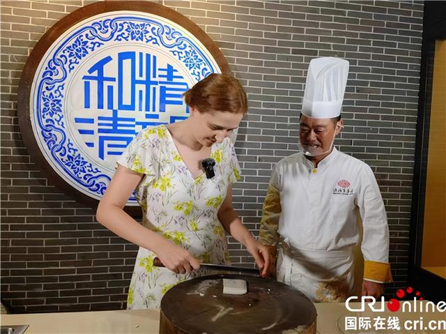 在學藝館,外國網(wǎng)紅在淮揚菜廚師的指導下,紛紛現(xiàn)場體驗周恩來總理最愛的淮揚菜——平橋豆腐的切法。