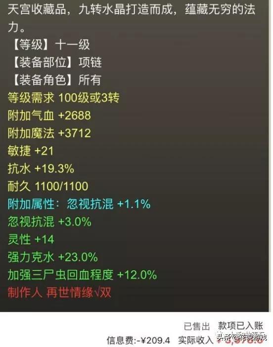 ]]>第一個幾率是玩家煉化出極品的11級項鏈。底子是敏捷加21,抗水加19.3,但是藍字非常優(yōu)秀忽視抗混加1.1,玩家只煉化出了忽視抗混加3,靈性加14的屬性就套現(xiàn)了,也許很多朋友會問為什么不乘勝追擊忽視抗混加4的煉化呢?幾率本來就是很難預測的,能克制住自己的貪欲,才能在網(wǎng)易的名利場里盈利。這條項鏈也成功套現(xiàn)4000多元。