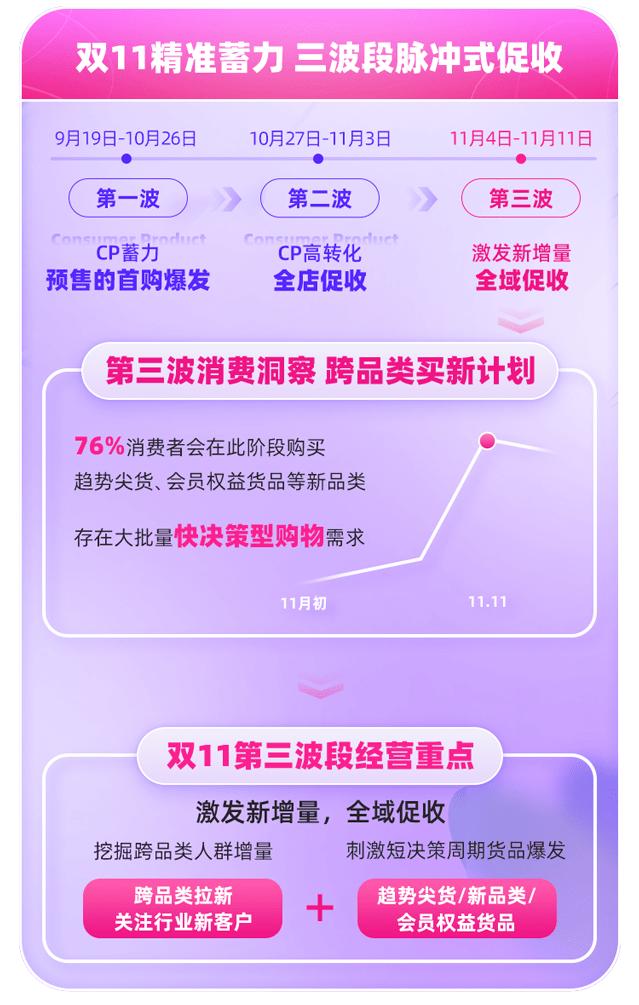所謂“三波段”,第一波為9月19日到10月26日,以人群、貨品資產(chǎn)蓄力,抓住具有長周期計劃的消費者,實現(xiàn)預(yù)售首購爆發(fā);第二波段是10月27日到11月3日,重點在于人群深度轉(zhuǎn)化,通過爆品帶次爆,促進(jìn)全店貨品爆發(fā);第三波段則是11月4日至11月11日,商家要集中關(guān)注跨品類人群增量,在大促收尾期抓住嘗鮮型和快決策型消費需求,從而全域促收。