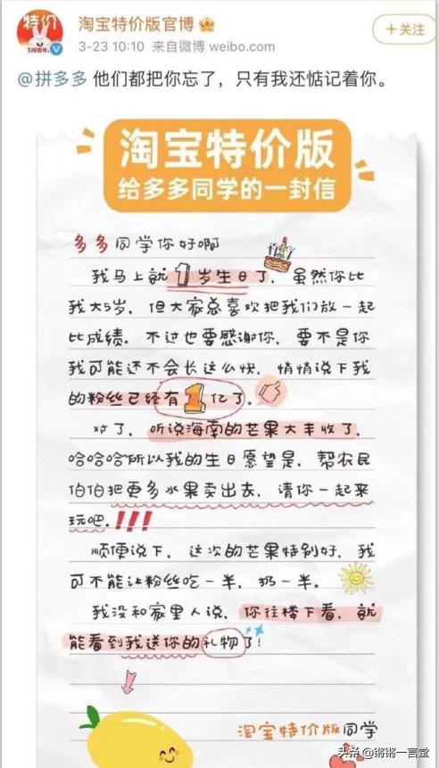 早在淘特一周年之際,那時(shí)尚是前身的淘寶特價(jià)版,就開始黏糊拼多多,微博上隔空喊話“我還惦記著你”,甚至打出“拼多多員工憑工牌可以免費(fèi)領(lǐng)芒果”的營(yíng)銷,把一幫阿里老員工臊得臉紅脖子粗,直呼“太尷尬”。