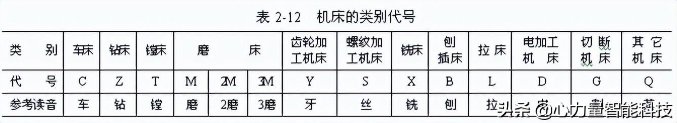 用大寫的漢語拼音字母代表機(jī)床的類別。例如,用"c"表示"車床",讀"車"。有的機(jī)床(如磨床)又由若干分類組成,分類代號(hào)用阿拉伯?dāng)?shù)字表示,置于類別代號(hào)之前,但第1分類不予表示。機(jī)床類別代號(hào)見表2-12。
