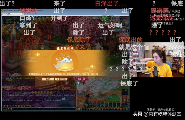 YJJ直到第100個晶幣才開出祥瑞白澤,引來水友們噓聲一片,而女流則站在月老旁邊,只用70個就出了白澤,可以說是比YJJ歐很多了。
