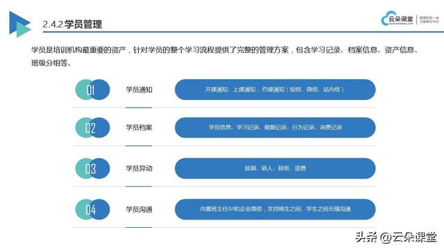 做在線教育saas的服務(wù)商有很多,為什么推薦云朵課堂?云朵課堂是唯一一家教育出身的saas服務(wù)商,更了解在線教育的痛點(diǎn),且是最早一批研發(fā)在線教育saas系統(tǒng)的企業(yè),技術(shù)成熟、功能豐富、售后完善。