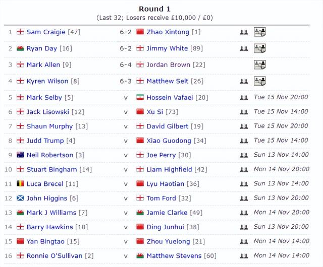 首個(gè)比賽日,除了趙心童、克雷吉之外,其他6名出戰(zhàn)的球員分別是:“小鋼炮”馬克-艾倫、最強(qiáng)90后“囧哥”凱倫-威爾遜,6次世錦賽亞軍吉米懷特、以及名將瑞恩-戴、喬丹-布朗、馬修-塞爾特。這四場(chǎng)比賽的對(duì)陣為:趙心童VS克雷吉、艾倫VS布朗、瑞恩-戴VS懷特、威爾遜VS塞爾特 ???。