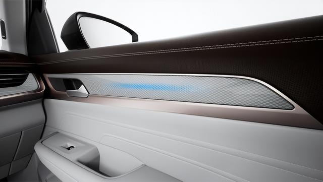 車身尾部,貫穿式的尾燈組我們見怪不怪,但是燈腔的內(nèi)部結(jié)構(gòu)確實是會吸引到很多人。除此之外,大面積的留白尾門也讓整車的視覺效果進一步提升。