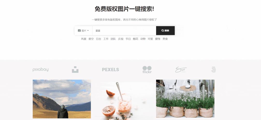 這個網(wǎng)站匯總了集合了六大國外免費(fèi)版權(quán)圖片庫資源,輸入中文關(guān)鍵詞就能搜到相關(guān)的照片,圖片質(zhì)量非常高,搜索速度也挺快的,相當(dāng)于擁有一個網(wǎng)站就能搜集全網(wǎng)的無版權(quán)圖片,再也不擔(dān)心圖片侵權(quán)問題了。