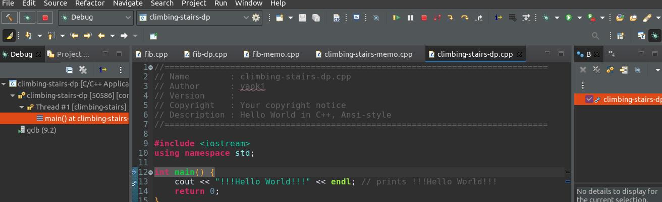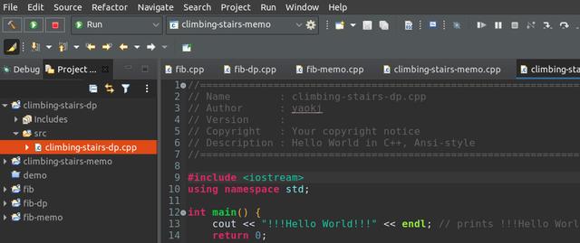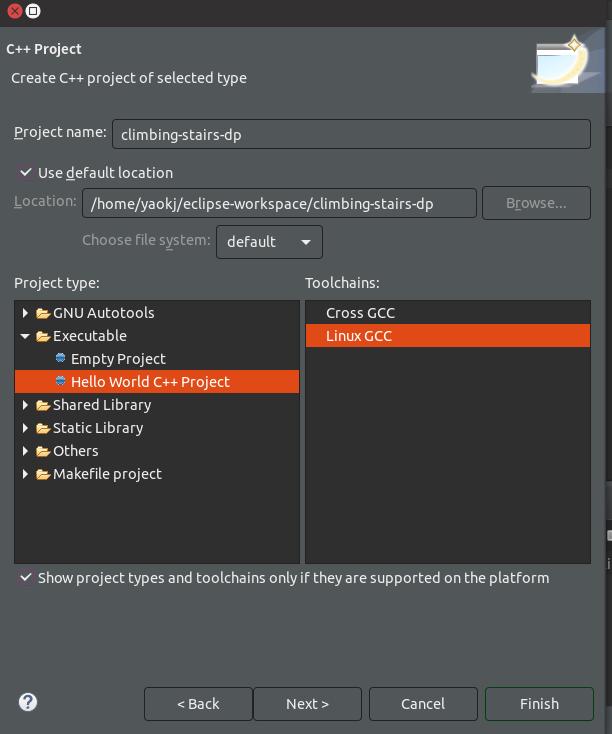 3、在Project name上寫上你的項目名,我填的內(nèi)容為:climbing-stairs-dp;再選擇Project type 下面的Executable 的 Hello World C++ Project 選擇一個例子的項目,方便我們使用,然后在Toolchains下選擇 Linux GCC,再點擊下一步Next