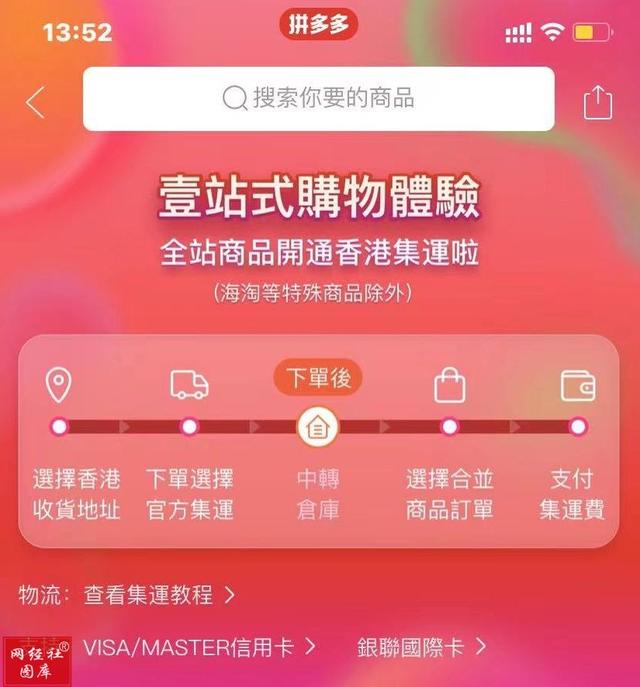 就在外界都密切關注“天貓香港”的有關消息時,國內另一電商巨頭拼多多悄然進軍香港。拼多多在近期開通了香港官方集運服務,且在內地銀行卡之外增加了Visa、Mastercard信用卡綁定。這就意味著在香港的用戶也可以使用拼多多進行購物了。