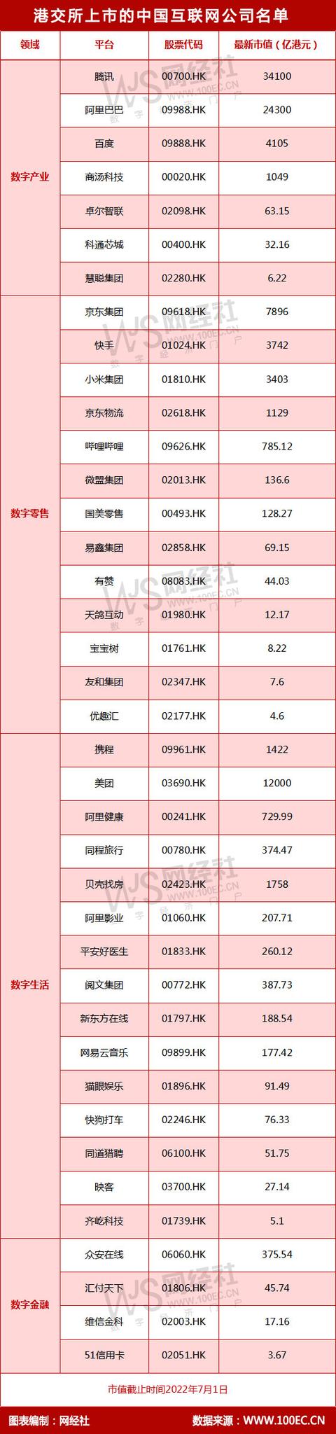 據(jù)網經社(WWW.100EC.CN)統(tǒng)計,在港交所上市(包括二次上市)的互聯(lián)網公司包括:(1)數(shù)字產業(yè)(7家):阿里巴巴、騰訊、慧聰集團、商湯科技、百度、科通芯城、卓爾智聯(lián)等;(2)數(shù)字零售(13家):快手、小米集團、寶寶樹、京東集團、嗶哩嗶哩、有贊、天鴿互動、京東物流、國美零售、易鑫集團、微盟集團、優(yōu)趣匯、友和集團等;(3)數(shù)字生活(15家):攜程、同程旅行、閱文集團、阿里健康、阿里影業(yè)、齊屹科技、快狗打車、貝殼找房、平安好醫(yī)生、映客、新東方在線、同道獵聘、美團、貓眼娛樂、網易云音樂等;(4)數(shù)字金融(4家):匯付天下、51信用卡、眾安在線、維信金科等;以上39家公司總市值約為99221港元。