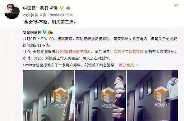 2016年11月9日晚11點(diǎn),卓偉工作室發(fā)布了劉愷威深夜進(jìn)入王鷗的房間,獨(dú)處4個(gè)小時(shí),劉愷威悄然離開,據(jù)悉,當(dāng)時(shí)劉愷威和王鷗合作電視劇《莽荒記》。隨后,卓偉又發(fā)出了第二段視頻。凌晨1點(diǎn)多劉愷威講助手送回房間后,獨(dú)自又來到王鷗房間,這一次他們兩個(gè)單獨(dú)呆了將近兩個(gè)小時(shí)。