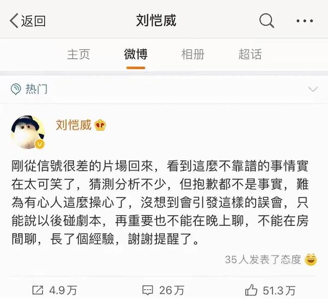 隨后劉愷威發(fā)微博回應(yīng):剛從信號很差的片場回來,看到這么不靠譜的事情實(shí)在太好笑了,猜測分析不少,但抱歉都不是事實(shí),難得有人這么操心,沒想到會引發(fā)這樣的誤會,只能說以后碰劇本,在重要也不能在晚上聊,不能在房間聊,長了個(gè)經(jīng)驗(yàn),謝謝提醒了!